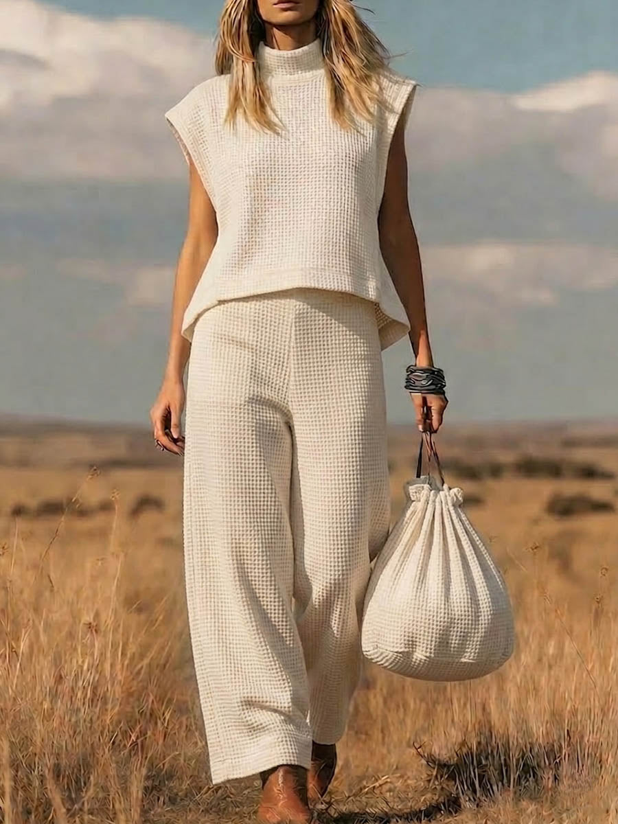 Women's Solid-color Stand-collar Sleeveless Casual Waffle-knit Cotton Top And High-waisted Wide-leg Pants Set