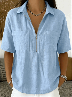 Featuring a modern half-zip neckline and breathable cotton-linen fabric, this top delivers an effortlessly chic look that works perfectly for casual days, travel, and weekend outings.